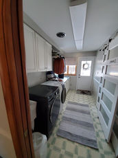 Our talented finish carpenter and designer collaborated closely to create a custom walnut veneer hood that elegantly complements the range and enhances the transition into the sunroom. We opted for luxury laminate vinyl tile flooring throughout the space, which replicates the appearance of ceramic tile. Initially, the homeowners were torn between two distinct paint colors and a charming wood-look cabinet. With the designer's guidance, they boldly embraced all three choices. The base cabinets showcase a modern wood laminate in a warm gunstock color, while the upper cabinets have a bright white finish, creating an airy feel. The island stands out as a striking focal point in a beautiful naval blue.